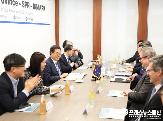 | ▲ 현지시간 29일 오후 코트라 시드니무역관에서 김동연 경기도지사, 지호준 인마크 글로벌 상무, 최흥용 SPR 부사장, 등이 참석한 가운데 SPR-INMARK 투자행사가 열리고 있다.(사진=경기도) |