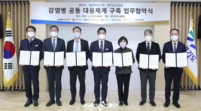 오병권 경기도지사 권한대행, 백남종 분당서울대병원장, 한상욱 아주대병원장, 신응진 순천향대부천병원장, 유경호 한림대성심병원장, 김운영 고대안산병원장, 정일용 경기도의료원장은 5일 경기도청 신관 상황실에서 이러한 내용의 ‘경기도 감염병 공동 대응체계 구축 업무협약’을 체결했다.