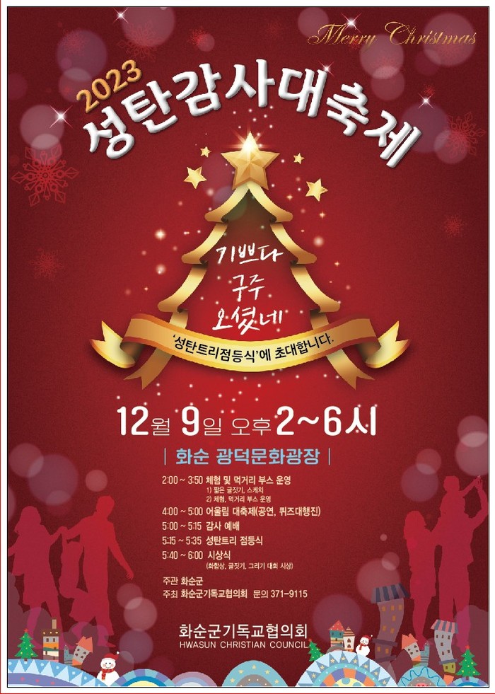 이날 2시부터 짧은 글짓기, 먹거리 부스를 운영하고 공연과 퀴즈문제풀이 행사에 이어 5시에는 사랑 실천의 문화를 확산하기 위해 화순기독교협의회 주최로 축하 예배와 공연, 성탄 트리 점등식 순으로 진행된다.