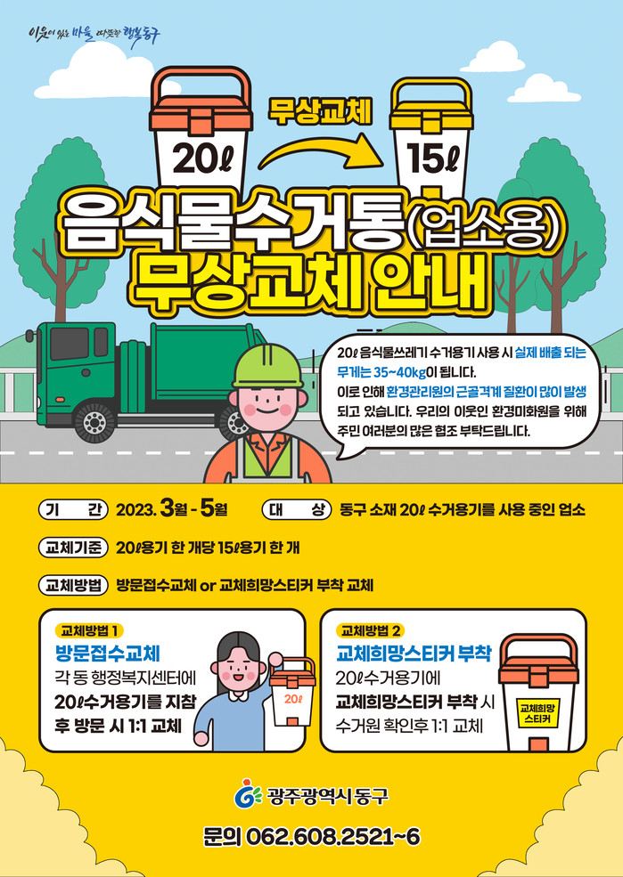 동구는 3월부터 5월까지 관내 20ℓ 수거 용기를 사용 중인 업소를 대상으로 15ℓ 용기로 무상 교체할 계획이다. 교체 방법은 관할 주소지 동 행정복지센터에 20ℓ 수거 용기를 지참 후 방문하거나, 교체 희망 스티커를 부착하면 수거원이 확인 후 1:1 교체할 예정이다.