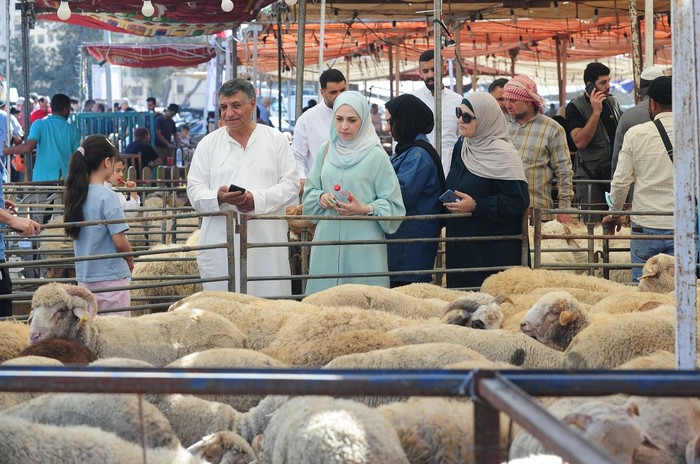 [프레스뉴스] 채정병 특파원=16일(현지시간) 이슬람 최대 명절 이드 알 아드하 첫날 아침, 요르단 암만도심 외곽에 마련된 양시장에서 한 가족이 구입할 양을 고르고 있다.