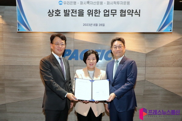 [프레스뉴스] 김대일 기자= 우리은행(은행장 조병규)은 지난 28일 ‘퍼시픽자산운용(대표이사 홍창민)’, ‘퍼시픽투자운용(대표이사 박종필)’과 업무협약을 체결하고, 앞으로 양사가 운용하는 대체자산펀드 수탁업무를 우선 협의하기로 했다고 29일 밝혔다.