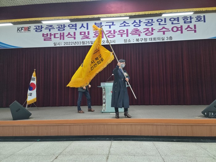 ▲ ‘2022년 광주광역시 북구 소상공인연합회 발대식 및 회장 위촉장 수여식’에서 오선신 회장이 북구 소상공인 연합회기를 휘날리며 힘찬 출발을 알렸다(사진제공=북구 소상공인연합회) |
