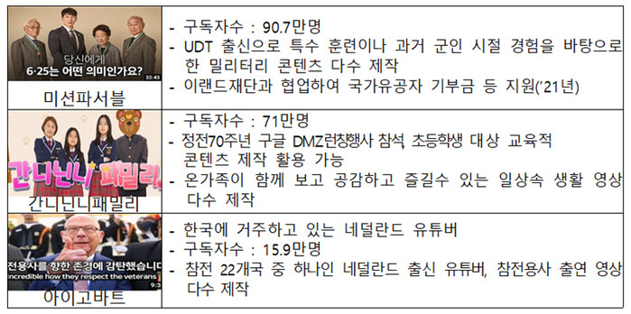또 유엔참전국인 네덜란드 출신으로 한국에 거주하며 참전용사 출연 영상을 다수 제작한 ‘아이고바트’도 함께 유명 인플루언서로 위촉돼 활동하게 된다.