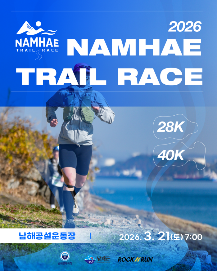 [프레스뉴스] 정재학 기자=남해군은 2026년 3월 21일 남해공설운동장에서 ‘2026 남해 트레일레이스’ 대회를 개최하고 참가자 접수를 시작한다. 남해군체육회 주최, ㈜락앤런 주관으로 40K(40.2km, 제한시간 10시간)와 28K(28.6km, 7시간) 두 코스로 운영된다.