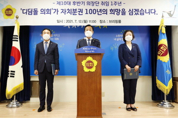 이날 오전 11시 의회 브리핑룸에서 비대면 온라인 생중계 방식으로 진행된 ‘제10대 경기도의회 후반기 의장단 취임 1주년 기자회견’에서 장현국 의장과 진용복(더민주, 용인3)·문경희(더민주, 남양주2) 부의장은 ‘디딤돌 의회가 자치분권 100년의 희망을 심겠습니다’라는 제목의 기자회견문을 발표했다.