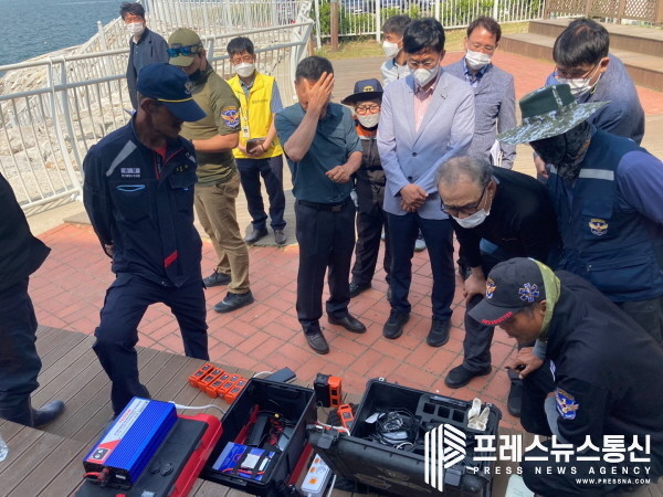 | ▲ 이민근 안산시장 당선인, 시화호조력발전소 수난사고 현장방문(이민근 당선인이 민간행양구조대 관계자를 격려하고 드론수색장면을 지켜보고 있다.)사진=안산시장직 인수위원회 |