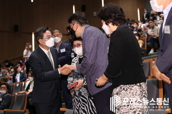 | ▲ 11일 오전 경기도청 대강당에서 열린 제11회 인구의 날 기념식에서 김동연 경기도지사가 참석자들과 악수하며 인사를 나누고 있다.(사진=경기도) |