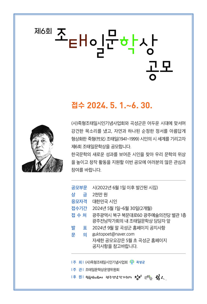 (사)죽형조태일시인기념사업회(이사장 박석무)와 곡성군(군수 이상철)이 주최하고, 한국작가회의, 광주전남작가회의, 창비, 문학들이 후원하는 <제6회 조태일문학상> 접수 기간은 5월 1일부터 6월 30일까지 2개월간이며, 최근 2년 이내(2022년 6월 1일 이후)에 발간한 시집을 시인 본인이 제출하거나 추천위원의 추천을 통해 응모할 수 있다. 시상식은 오는 10월 곡성 조태일시문학기념관에서 펼쳐질 조태일 시인 25주기 문학 축전에서 열리며, 상금은 2천만 원이다.