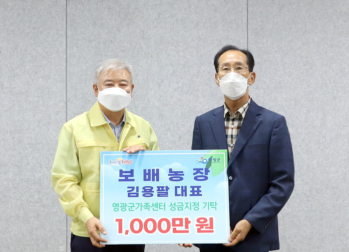 [전남=프레스뉴스] 강래성 기자= 보배농장(대표 김용팔)은 지난 11일, 모친상을 치른 후 조의금의 일부를 포함한 후원금 1천만 원을 영광군 영광군가족센터 사례관리대상자에게 써 달라며 기탁하였다.