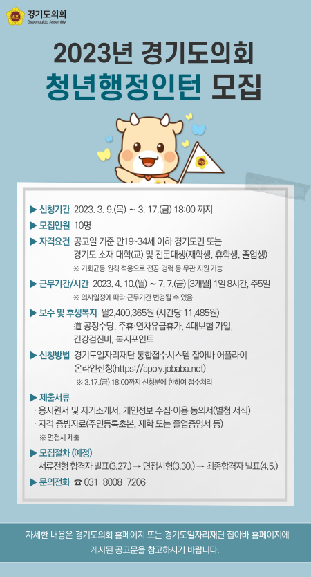 | ▲ 2023년 경기도의회 청년행정인턴 모집 포스터(사진=경기도의회) |