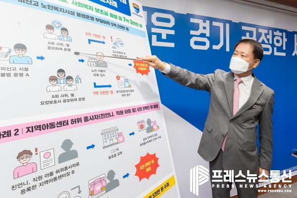 [프레스뉴스] 장현준 기자= 노인복지시설을 신고 없이 운영하면서 친인척과 공모해 노인들에게 수년간 이용료를 받아 챙긴 운영자, 가족을 종사자로 허위 등록해 보조금을 횡령한 시설장 등 불법행위를 저지른 사회복지시설이 경기도 공정특별사법경찰단 수사에 적발됐다.