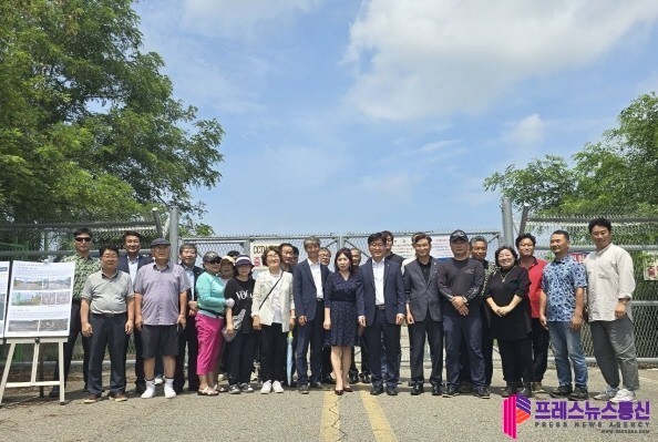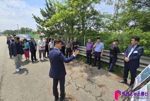| ▲19일 방아머리 미개통 도로입구에서 열린 ‘시화방조제 유지관리통로 이용방법 개선(안)설명회’(사진=박해철 의원실) |