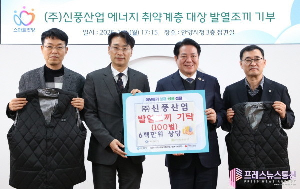 [프레스뉴스] 장현준 기자= 안양시는 5일 오후 5시 15분 시청 3층 접견실에서 관내 기업인 ㈜신풍산업이 지역 저소득층 및 에너지 취약계층의 겨울철 생활 안정을 돕기 위해 발열조끼 100벌(600만원 상당)을 기탁했다고 밝혔다.