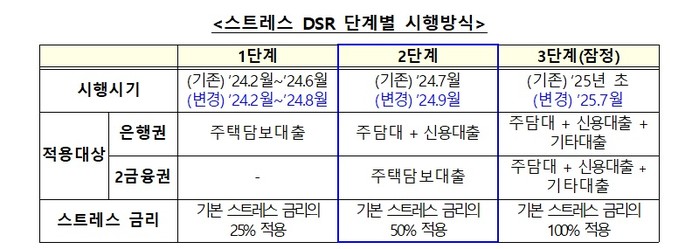 스트레스 DSR은 단계적·점진적으로 시행 중이며, DSR이 적용되는 모든 가계대출에 대해 스트레스 금리를 적용하는 스트레스 DSR 3단계의 시행시기는 제도의 안착 추이 등을 보아가며 다음 달 확정할 예정이다.