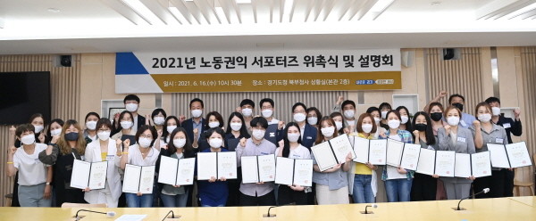 [프레스뉴스] 김대일 기자= 경기도가 16일 경기도청 북부청사에서 올해 편의점 등 소규모 사업장 종사 단시간·취약노동자의 권익 향상과 노동인권 사각지대 해소를 위해 활동할 ‘경기도 노동권익 서포터즈’를 대상으로 위촉장 수여식을 진행했다.