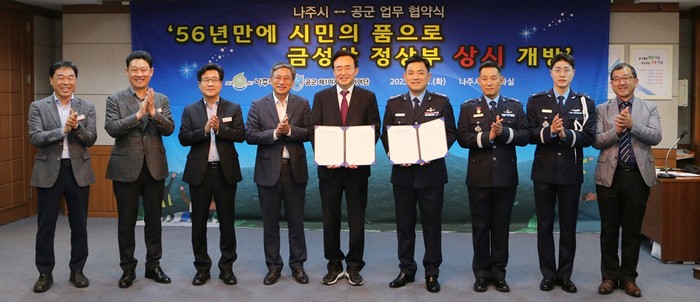 나주시(시장 윤병태)는 11일 시청사 이화실에서 공군제1미사일방어여단(여단장 이종서)과 ‘금성산 정상부 상시 개방 협약’을 체결했다고 밝혔다.
