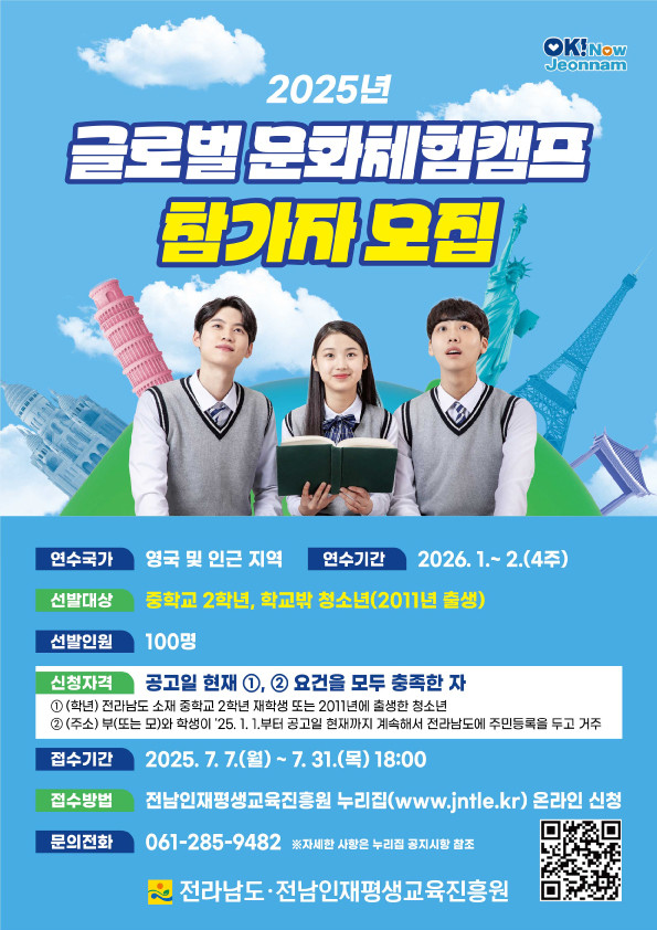 선발은 서류심사→영어 필기시험→연수계획서 및 영어면접의 3단계로 진행되며, 최종 합격자는 10월 2일(목) 전남인재평생교육진흥원 누리집을 통해 발표된다.