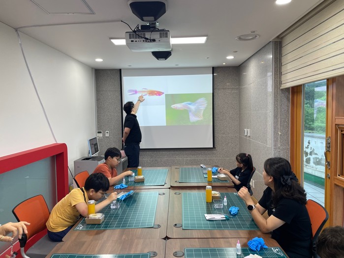이어 2층 세미나실로 이동해 골격염색표본 키링 제작 체험이 진행됐다. 참가자들은 어류 표본을 선택해 투명 병에 담고, 식물성 글리세린을 주입한 뒤 병마개와 키링 고리를 결합하며 완성품을 제작했다.