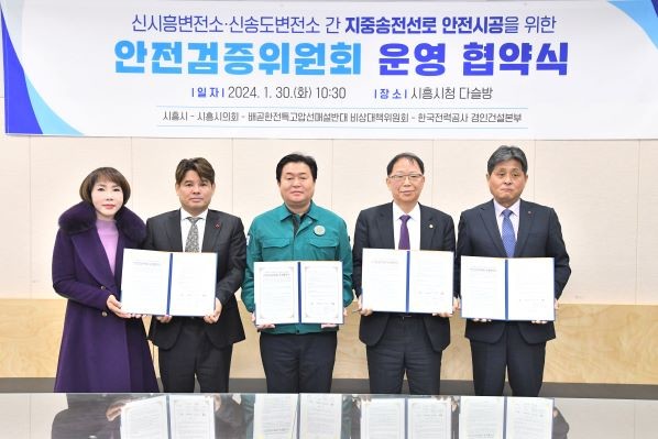 [프레스뉴스] 장현준 기자= 시흥시(시장 임병택)가 지난 30일 시청 다슬방에서 시의회(의장 송미희), 배곧 한전 특고압선 매설 반대 비상대책위원회(이하, 비대위), 한국전력공사(이하, 한전) 경인건설본부와 함께 ‘시흥-인천 전력구 공사 관련 안전검증위원회 운영’ 협약식을 열었다.