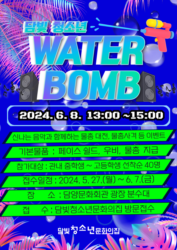 이번 행사는 더위에 지친 청소년들의 스트레스 해소를 위해 담양군 청소년 참여기구가 주도적으로 직접 행사를 기획했으며, 물총 대전, 물총 사격 등 물을 이용한 시원한 게임을 진행한다.