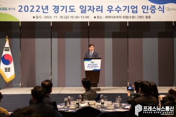 경기도는 18일 라마다플라자수원호텔 그랜드볼룸에서 ‘2022년도 경기도 일자리 우수기업 인증서 수여식’을 개최했다.