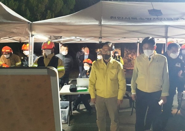 ▲ 박상돈 천안시장이 23일 오후 8시 13분경 성거읍 소재 해태제과 공장에서 화재가 발생함에 따라 현장을 방문해 피해상황을 점검하고 있다. (사진제공=천안시) |