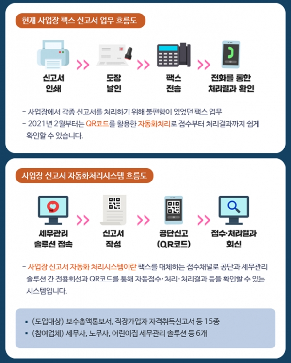 공단은 지난 2월 직장가입자 보수총액 통보서 신고업무를 시작으로 24일부터 사업장의 4대 사회보험 공통신고서(6종), 4월 7일에는 건강보험 고유 신고서(5종) 등 신고서별 처리 가능한 업무를 순차적으로 확대해 고객편의 향상 및 ‘팩스신고서 ZERO화’를 추진할 예정이다.