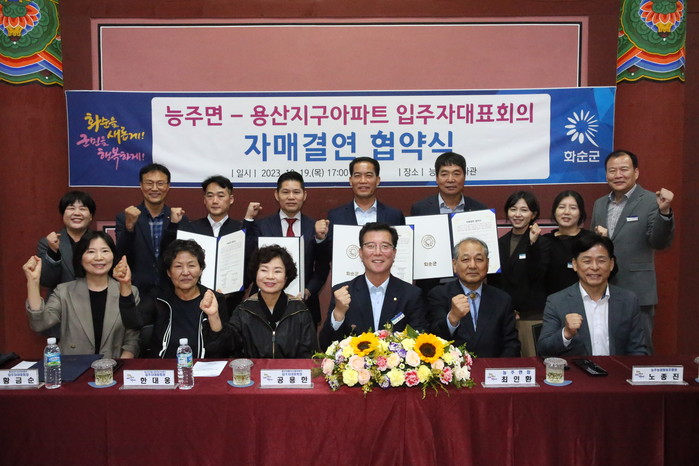 이날 협약식에는 최인환 능주면장, 노종진 능주농협 조합장, 용산지구 아파트 입주자대표회의 공용한, 한대웅, 한금순 회장을 비롯한 대표단 6명과 협약식을 축하해 주기 위해 강종철 화순군 부군수 등이 참석했다.