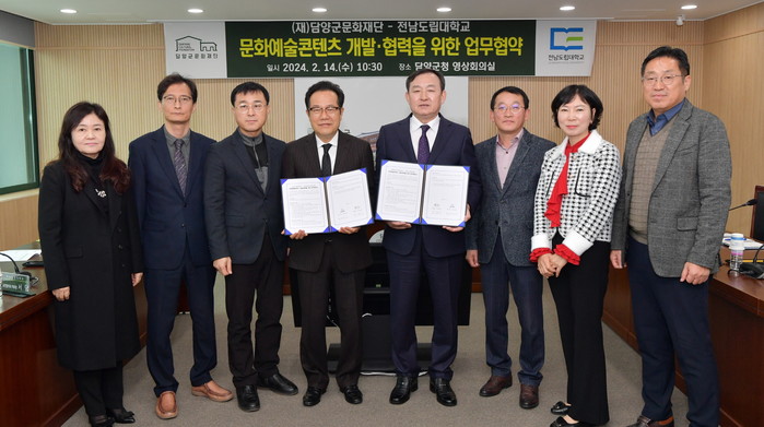 [전남=프레스뉴스] 박정철 기자=(재)담양군문화재단(이사장 이병노)은 지난 14일 담양군청 영상회의실에서 전남도립대학교(총장 조명래)와 문화예술 콘텐츠 개발‧협력을 통한 상생 발전을 위한 업무협약을 체결했다.