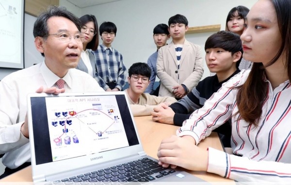 ▲ 순천향대 정보보호학과 염흥열 교수가 사이버보안연구실 연구원들과 함께 연구과제 관련 다양한 의견을 교환하고 있다(사진제공=순천향대) |
