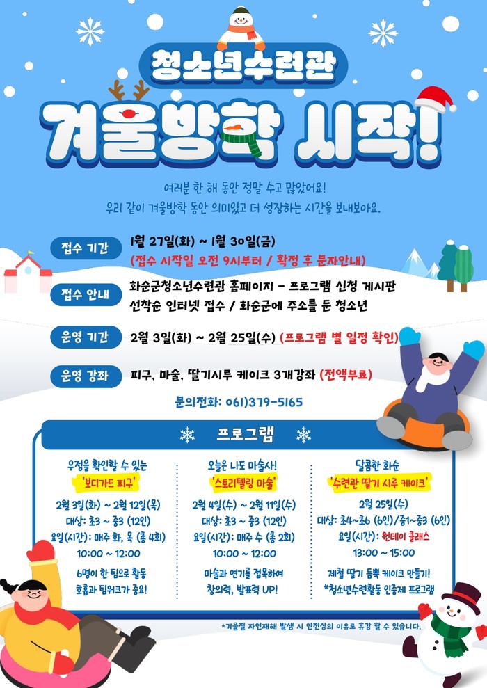 이번 겨울방학 프로그램은 ▲보디가드 피구 ▲스토리텔링 마술 ▲달콤한 화순‘수련관 딸기 시루 케이크 만들기’ 등 총 3개 강좌로 운영된다.