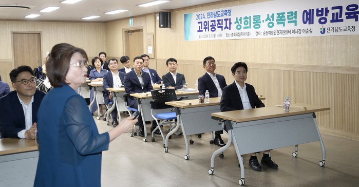 | ▲지난 2일 전라남도교육청 중회의실에서 ‘2024. 전라남도교육청 본청 고위공직자 성희롱·성폭력 예방 교육’을 주제로 한 연수가 진행되고 있다./전남교육청 제공 |