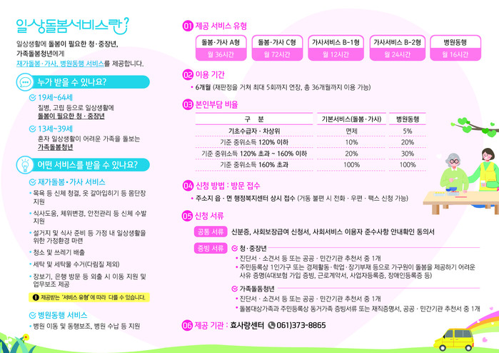 화순군 일상돌봄서비스는 질병, 고립 등으로 일상생활에 도움이 필요한 청‧중장년층에게 기본서비스(재가 돌봄 및 가사)와 특화 서비스(병원 동행)를 제공한다.