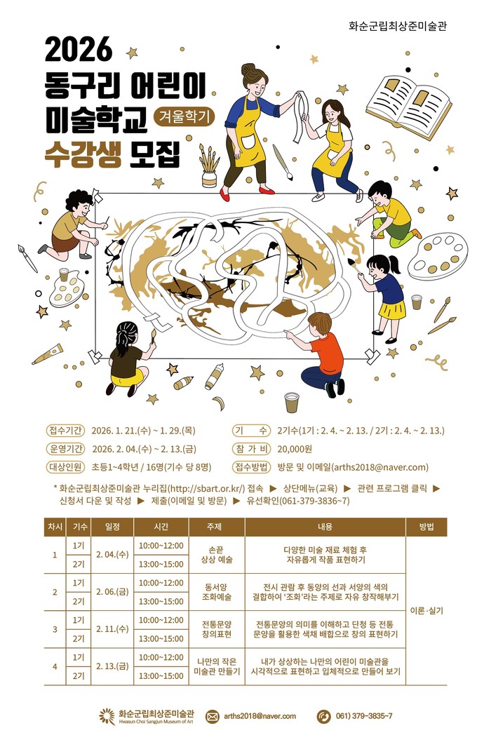 | ▲2026년 ‘동구리 어린이 미술학교’ 수강생 모집 홍보 포스터(사진제공=화순군) |