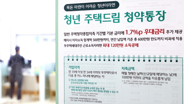 | ▲납입금액에 대해 최고 연 4.5% 금리를 제공하는 청년주택드림청약통장이 출시된 21일 서울 중구 하나은행 명동점에 홍보물이 붙어 있다.(사진=뉴스1) |