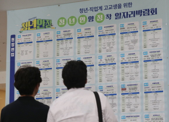 | ▲지난 5월 8일 경기 안양시 만안구 안양아트센터에서 열린 청년 안양정착 일자리 박람회에서 구직자들이 채용게시대를 보고 있다.(사진=뉴스1) |