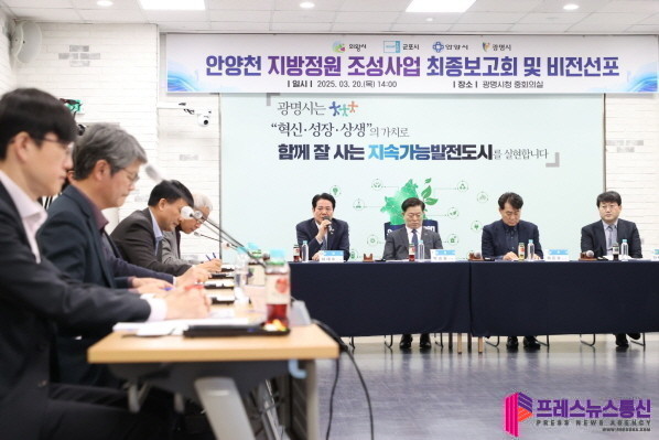 20일 오후 2시 광명시청 2층 중회의실에서 최대호 안양시장, 박승원 광명시장, 하은호 군포시장, 안치권 의왕 부시장을 비롯해 각 도시 관계 공무원, 자문위원, 용역사 등이 참석한 가운데 ‘안양천 지방정원 조성사업 기본 및 실시설계용역’ 최종보고회를 열었다.
