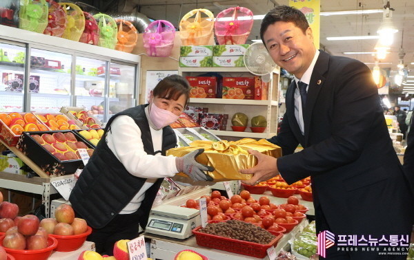 김 의장은 간담회 이후에는 시장 내 상가들을 차례로 찾아 과일, 쌀, 생필품 등을 직접 구매하며, 불안한 경제 상황에 답답함을 토로하는 상인들을 격려하는 시간을 가졌다.