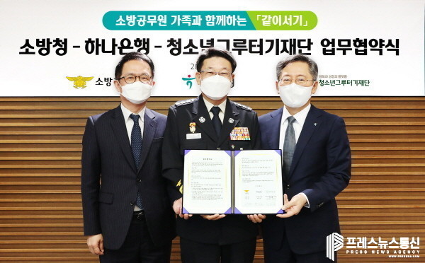 [프레스뉴스] 김대일 기자= 하나은행(은행장 박성호)은 9일 오전 을지로 본점에서 소방공무원 및 순직 소방공무원 자녀의 건강한 성장과 안정적인 사회 정착 지원을 위해 청소년그루터기재단(이사장 김정태), 소방청(소방청장 이흥교)과 함께 「‘같이 서기’를 위한 공동 업무 협약」을 체결했다고 밝혔다.