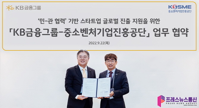 | ▲ ‘민-관 협력’ 기반 스타트업 글로벌 진출 지원을 위한 「KB금융그룹-중소벤처기업진흥공단」업무 협역(사진=KB금융그룹) |
