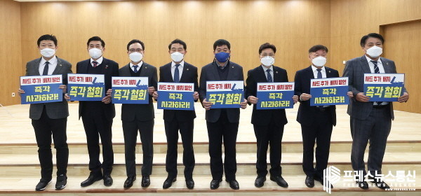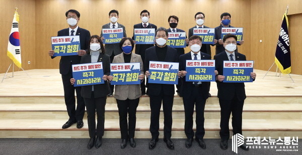 [프레스뉴스] 김대일 기자= 경기도의회 진용복 부의장(민주당, 용인3) 등 용인 출신 지석환(민주당, 용인1), 엄교섭(민주당, 용인2), 남종섭(민주당, 용인4), 김용찬(민주당, 용인5), 유영호(민주당, 용인6), 김중식(민주당, 용인7), 고찬석(민주당, 용인8) 의원은 11일 경기도의회 대회의실에서 ‘국민의힘의 사드 추가배치 공약 철회’를 촉구하는 규탄대회를 펼쳤다.