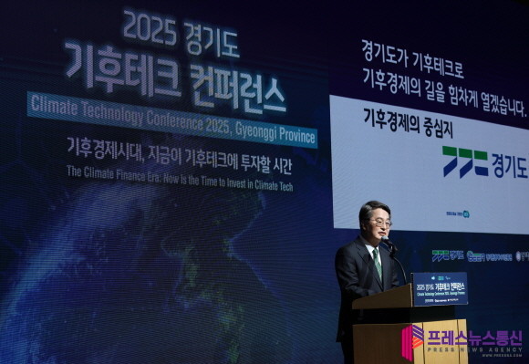 | ▲24일 오전 경기신용보증재단 3층에서 열린 2025 경기도 기후테크 컨퍼런스 개막식에서 김동연 경기도지사가 환영사 및 기후테크 비전 선언을 하고 있다.(사진=경기도) |