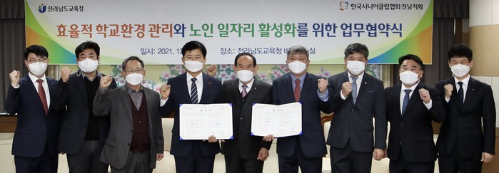 [전남=프레스뉴스] 강래성 기자= 전라남도교육청(교육감 장석웅)과 한국시니어클럽협회 전남지회(지회장 이정운)가 7일(화) 전라남도교육청 비즈니스실에서 효율적인 학교환경 관리를 위한 업무협약을 체결했다.