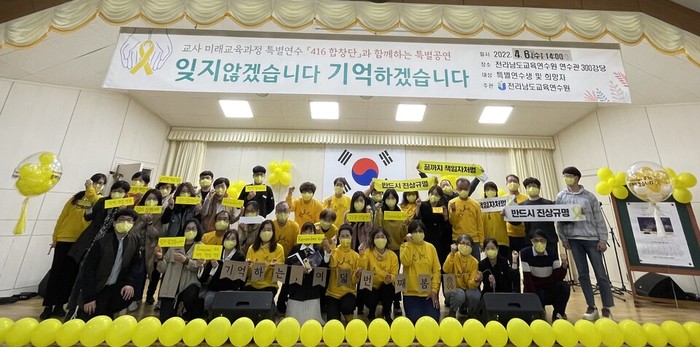 [전남=프레스뉴스] 강래성 기자= 전라남도교육연수원(원장 윤기정)은 4월 6일(수) 교사 미래교육과정 특별연수생과 교직원 65명을 대상으로 연수원 연수관 300강당에서「잊지 않겠습니다! 기억하겠습니다! 416합창단과 함께하는 특별공연」을 가졌다.
