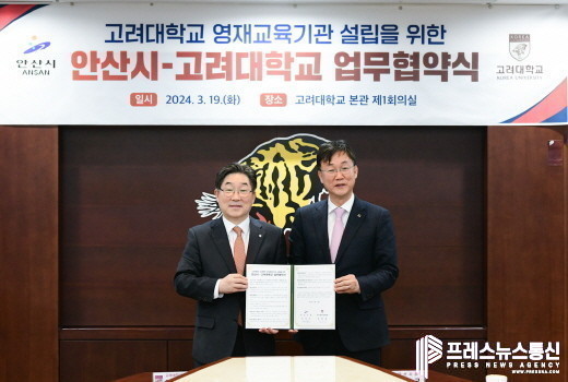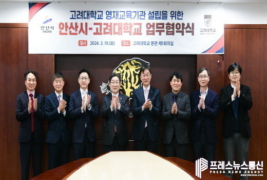 안산시(시장 이민근)는 지난 19일 오후 고려대학교 본관 제1회의실에서 이민근 안산시장과 김동원 고려대학교 총장, 권순영 안산병원장이 참석한 가운데 미래 인재 양성을 위한 영재교육기관 설립 업무협약(MOU)을 체결했다고 20일 밝혔다.