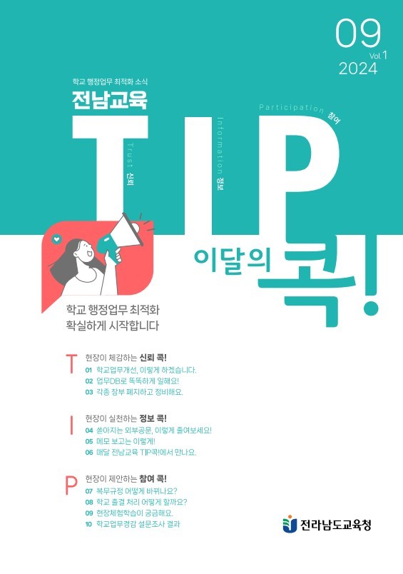 먼저 ‘전남교육 TIP(팁)콕’은 학교 현장에서 필요로 하는 학교업무 최적화 내용을 담아 매월 현장에 안내하는 웹 소식지다. 소식지는 T(Trust, 신뢰), I(Information, 정보), P(Participation, 참여) 세 가지로 구성된다.