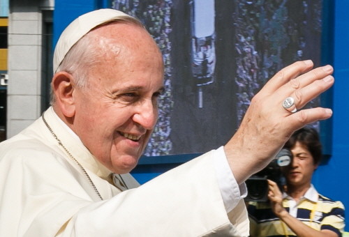 ▲프란치스코 교황이 2014년 8월 16일 서울 광화문광장에서 열린 '윤지충 바오로와 동료 123위 시복미사'에 참석하기 위해 시청에서 광화문까지 카퍼레이드를 하며 천주교 신자들을 향해 손을 들어 인사하고 있다.(사진= 뉴스1) |