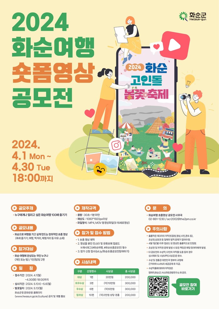 [전남=프레스뉴스] 박정철 기자=화순군(군수 구복규)은 4월 1일(월)부터 4월 30일(화)까지 30일간 ‘누구에게나 알리고 싶은 화순여행 100배 즐기기’를 소재로 한 참신하고 특색있는 숏폼(짧은 동영상) 영상을 선정하여 관광화순 홍보에 활용하고자 '2024 화순여행 숏폼영상 공모전을 추진한다고 밝혔다.