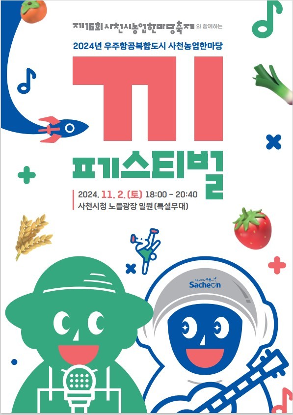 이번 <끼> 페스티벌은 우주항공청 개청을 기념하고, 물가상승 장기화로 어려워진 농업·농촌의 활력을 도모하기 위해 11월 2일 오후 6시 사천시청 노을광장 특설무대에서 열린다.